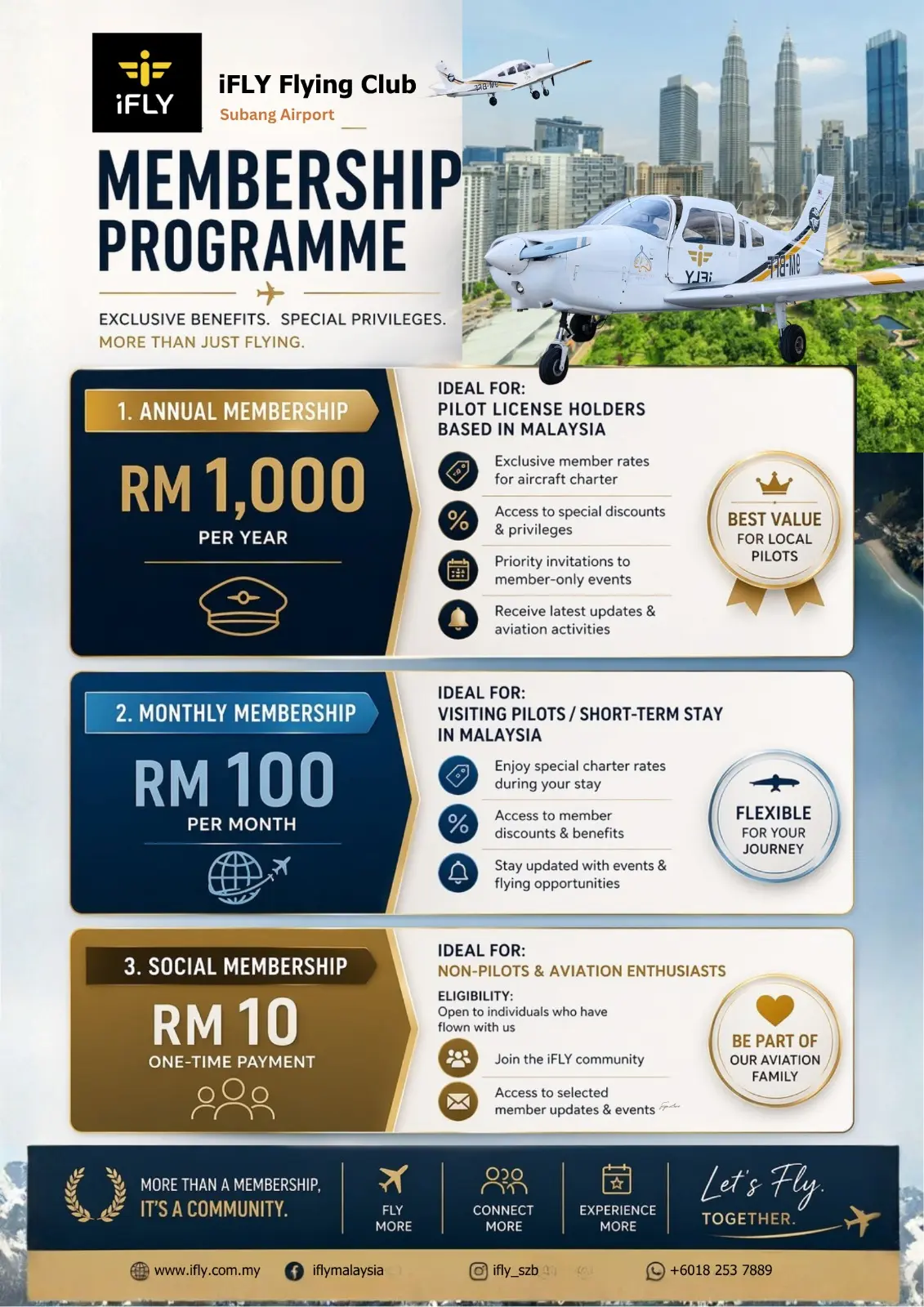 Aircraft Rent Price RM1050 (per members only) per FLIGHT TIME HOUR (measured in 1 Flight time/ per hour)